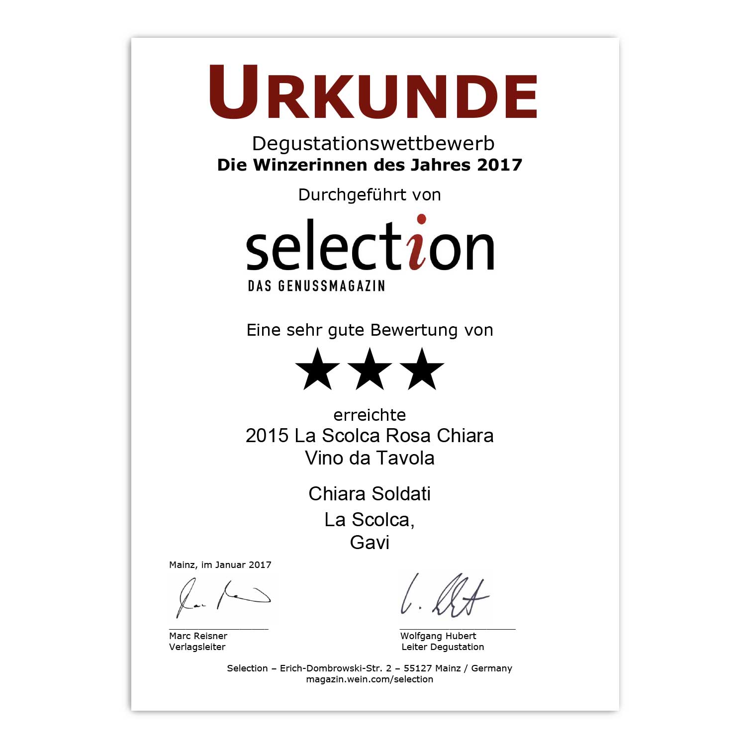 Urkunde 2017 La Scolca Rosa Chiara